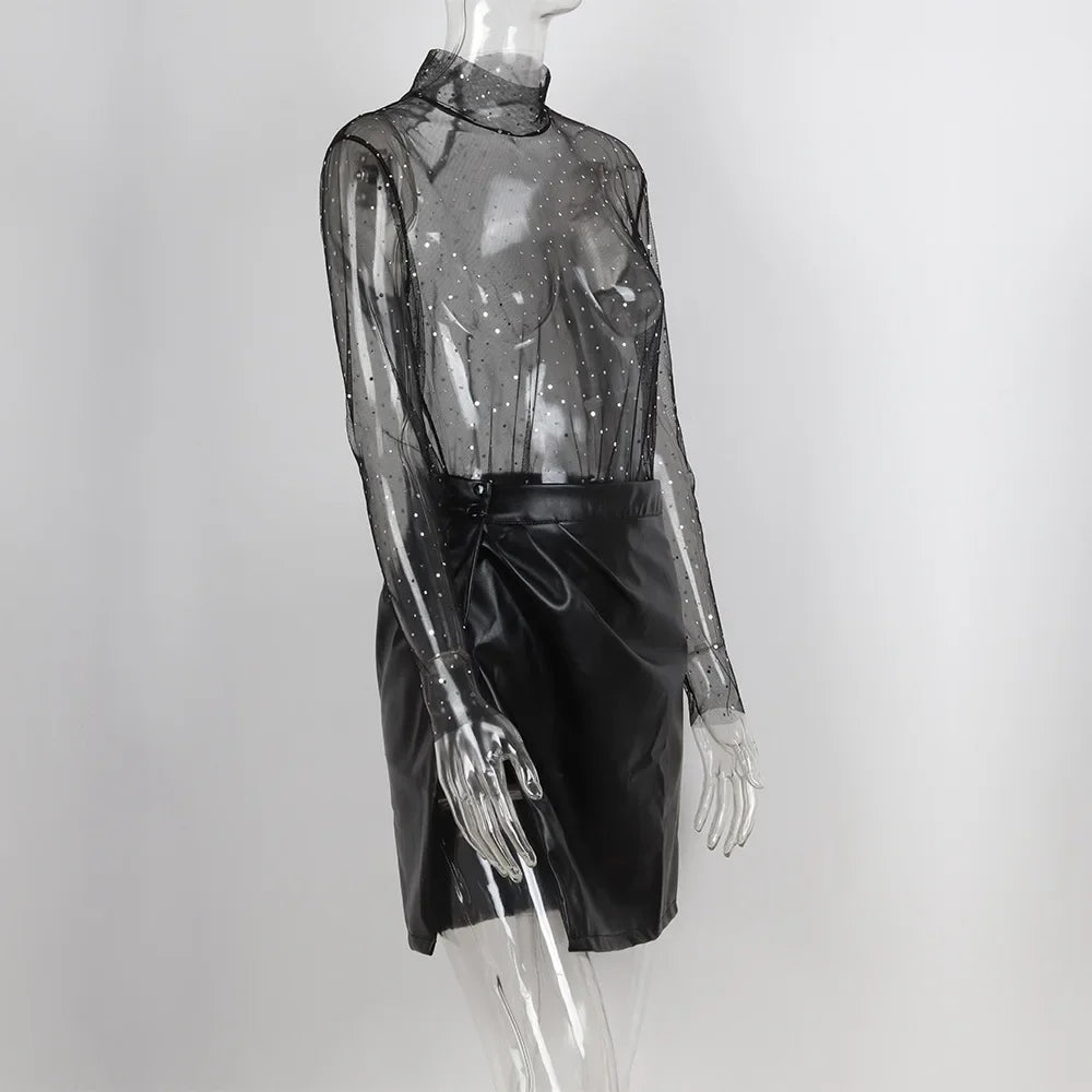 This daring mesh blouse sparkles with sequins and features a stand collar and long sleeves. Its slight stretch and straight fit offer comfort and ease, while the retro wave pattern adds vintage flair. Perfect for adding an elegant, artistic touch to your look.