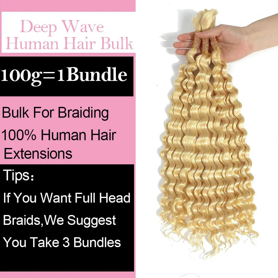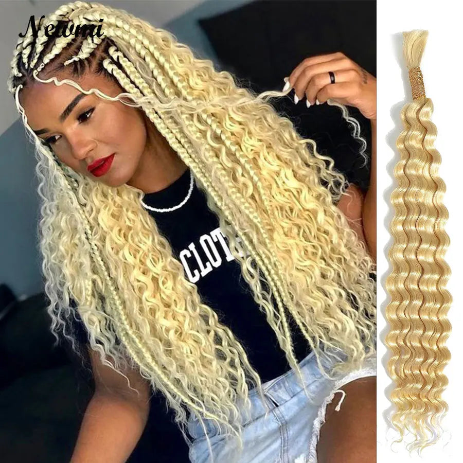 Brazilian human hair in deep wave texture, perfect for boho braids. Blonde #613 color ready for perming and dyeing. Long, natural waves with 51%-70% length variation for a bold, stylish look.