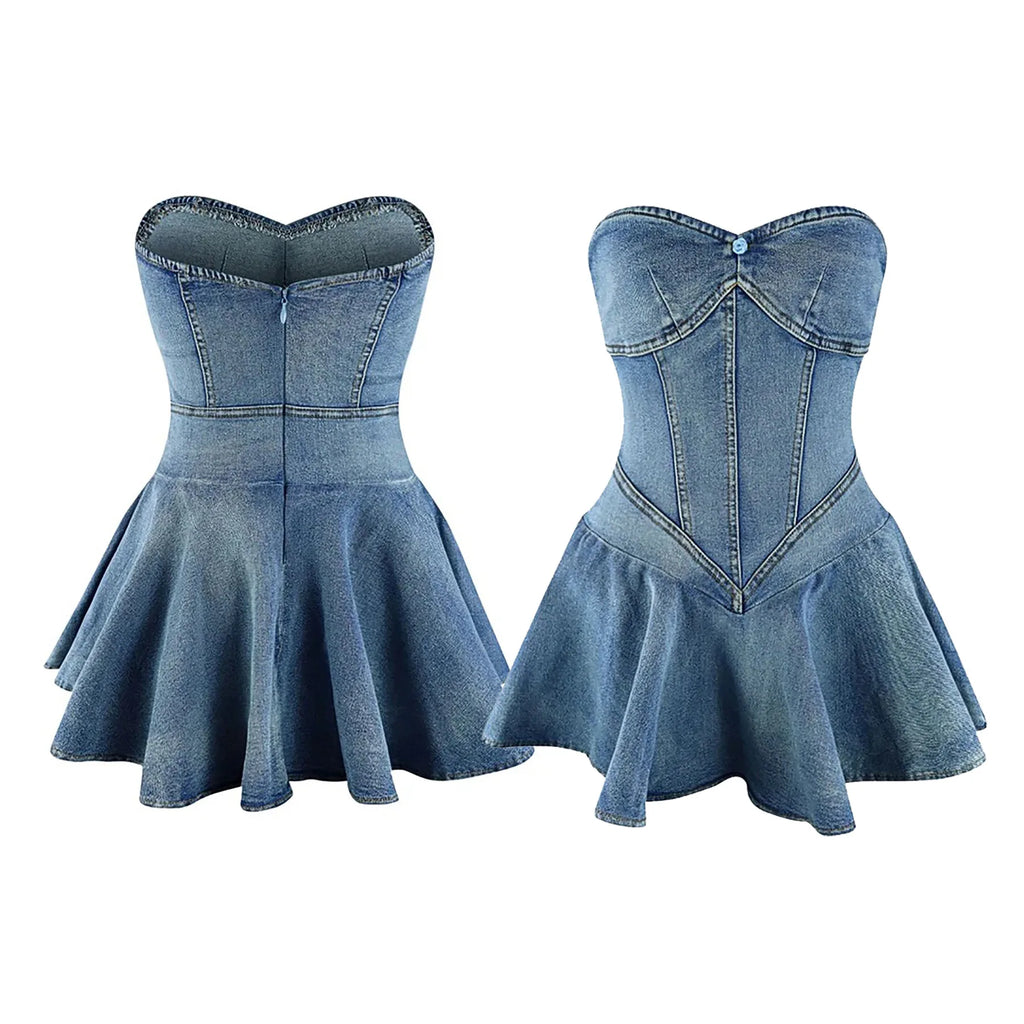 Rock the party in the Trendy Denim Heart Shaped Party Dress. This edgy mini features a strapless neckline, backless cut, and A-line silhouette that demands attention. Crafted from durable denim with a hint of stretch, it pairs bold style with comfort. The natural waistline and sleek zipper closure complete this daring look perfect for unforgettable nights out.