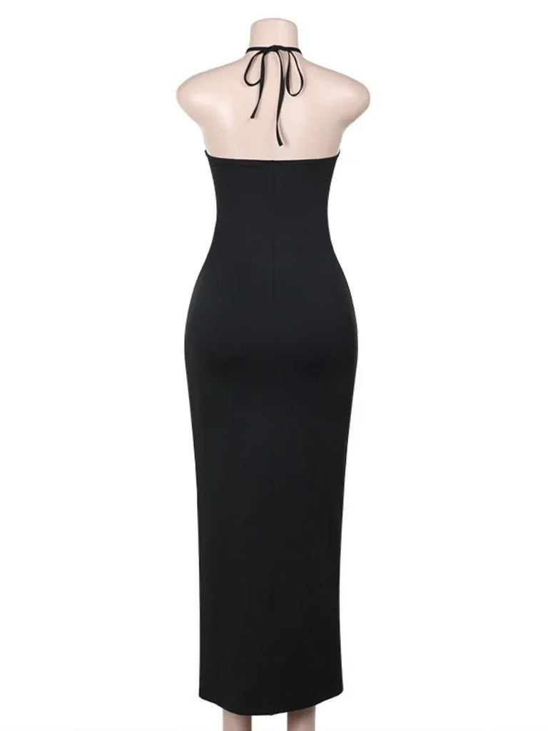 This sleek black formal dress features a daring backless design with hollow-out patchwork. Slim fit and ankle length suit any season, while the halter neck and off-shoulder style add bold, sexy flair. Perfect for club nights and special occasions. Cake not included!