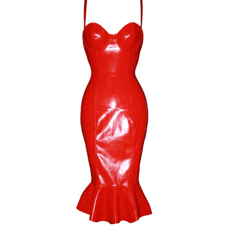This bold, knee-length party dress features a slim, strapless design with thin straps and a shiny faux patent leather with ruffle finish. Its stretchy fabric hugs your curves, while playful ruffles add a flirty touch. Perfect for night outs, it fastens with a zipper for a sleek fit that commands attention wherever you go.