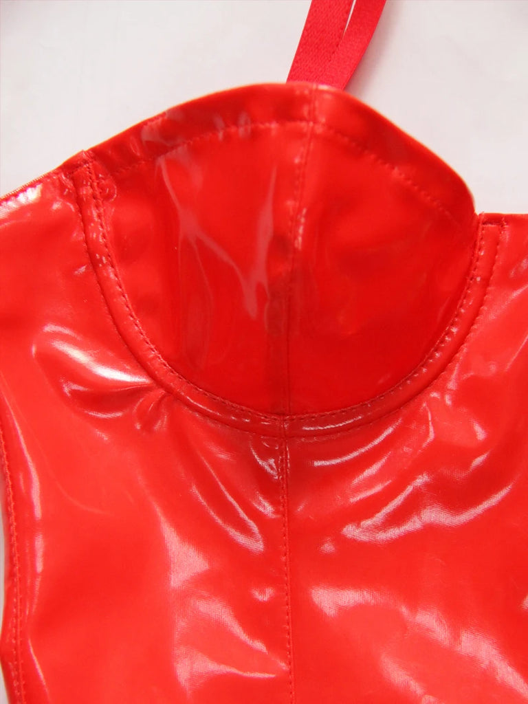 Trendy Thin Strap Ruffle Faux Patent Leather Party Dress