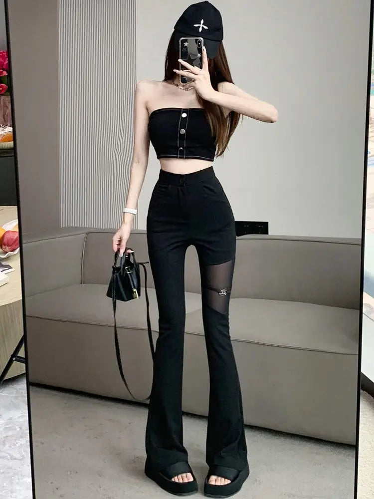 These high-waisted flare pants feature daring hollow-out mesh details and a slim fit for a bold, fashion-forward look. Crafted from a comfortable cotton-polyester blend with slight stretch, they offer full-length coverage while enhancing your silhouette with flared legs. Perfect for making a statement with effortless style.