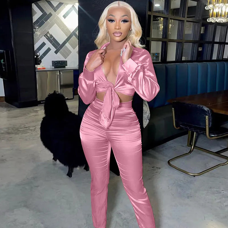 This daring two-piece set features a lace-up crop top and sleek high-waist pencil pants, designed to hug your curves with a slim fit and stretchy satin fabric. Perfect for making a statement at parties or nights out, it combines sexy style with bold comfort.