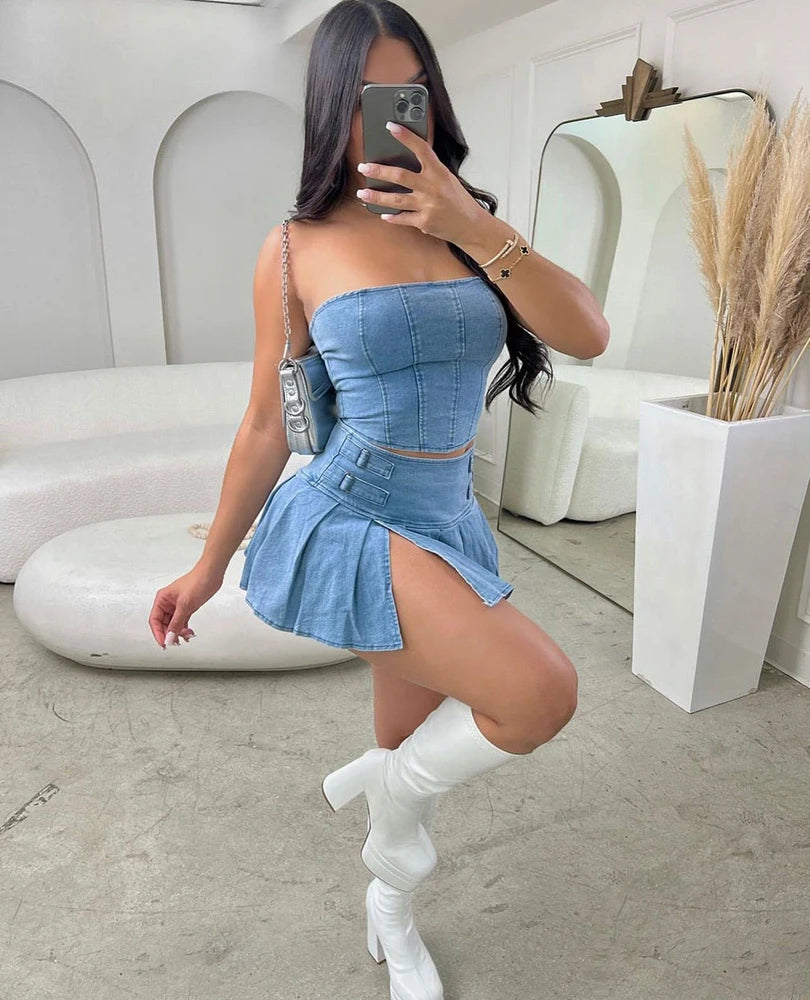 Turn heads in this playful two-piece set featuring a pleated denim skirt and a strapless top. The lightweight cotton-polyester blend keeps you comfortable while the mini skirt and sleeveless design show off your bold, confident style. Perfect for summer days when you want to keep it sweet and daring.