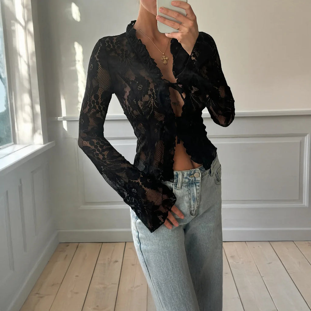 Trendy Lace Mesh Chiffon Long Sleeve Blouse