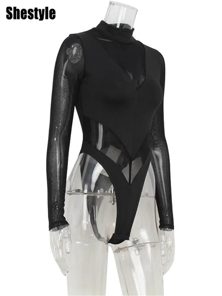 This daring patchwork mesh bodysuit features medium stretch polyester for a sleek, skinny fit that highlights your figure. Designed for confident nights out, its transparent design and bold construction make a striking statement. Available in sizes S to L to perfectly match your shape.