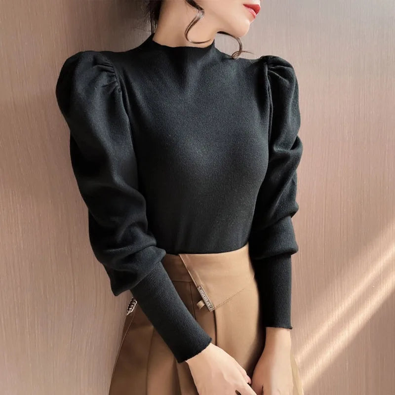 Trendy Turtle Neck Puff Flare Sleeve Blouse