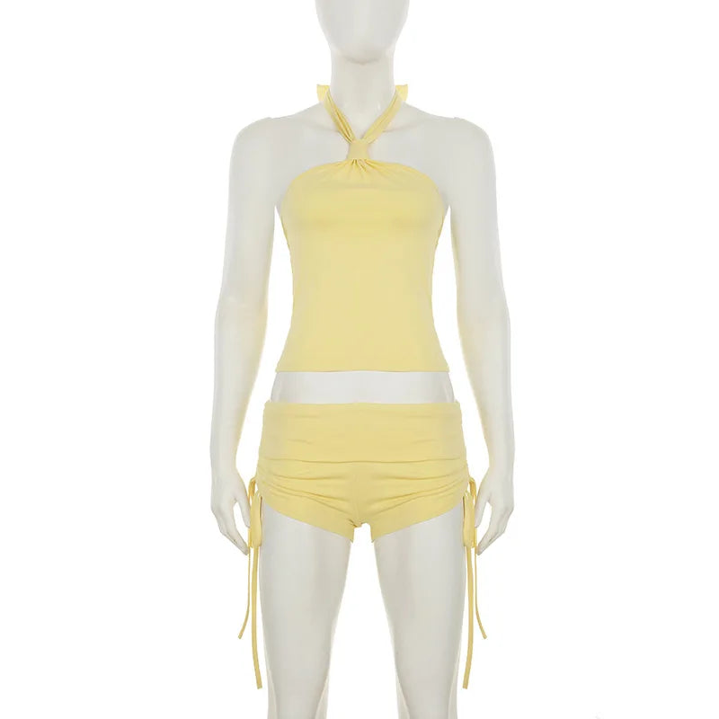 Trendy Yellow Yoga Halter Two Piece Drawstring Bottoms Set