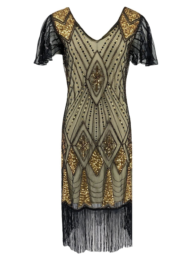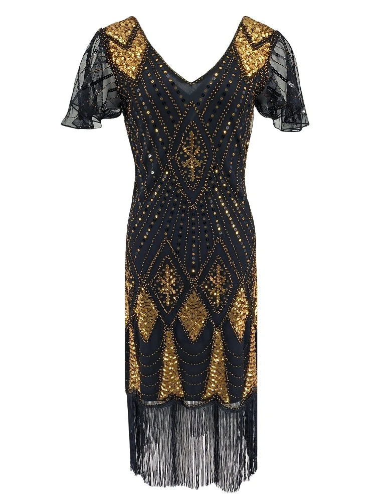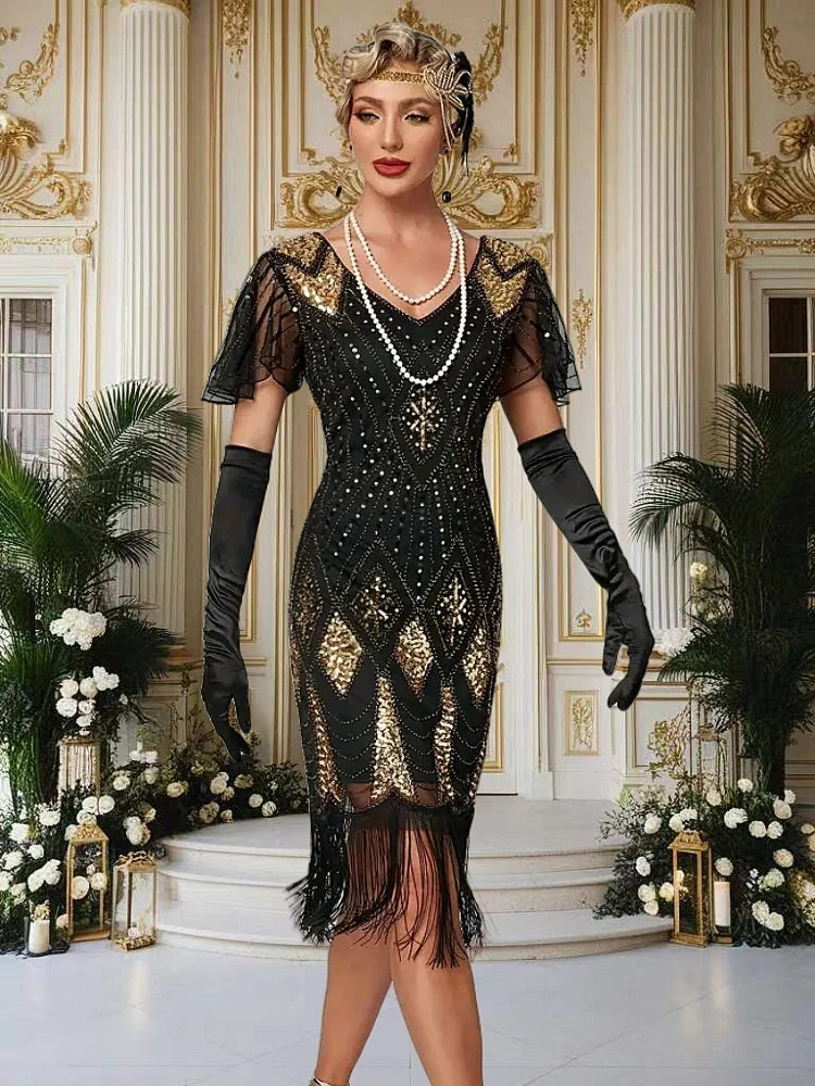 Step back into the roaring '20s with this fringed butterfly sleeve dress, perfect for Gatsby parties or Halloween fun. Featuring a sleek V-neck, sparkling sequins, and a flattering sheath silhouette, it offers a playful yet elegant vibe. Available in sizes S to 3XL, this mid-calf length dress adds a touch of vintage glamour to your night out.
