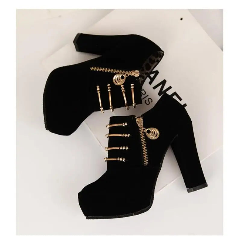 "Take a walk on the wild side in these trendy high heel ankle boots. With a sleek modern style and square heel, these boots are sure to turn heads. Made of durable flock material, they feature a round toe and metal decoration. Perfect for a night out or a playful day look. (Catwalk not included!)"