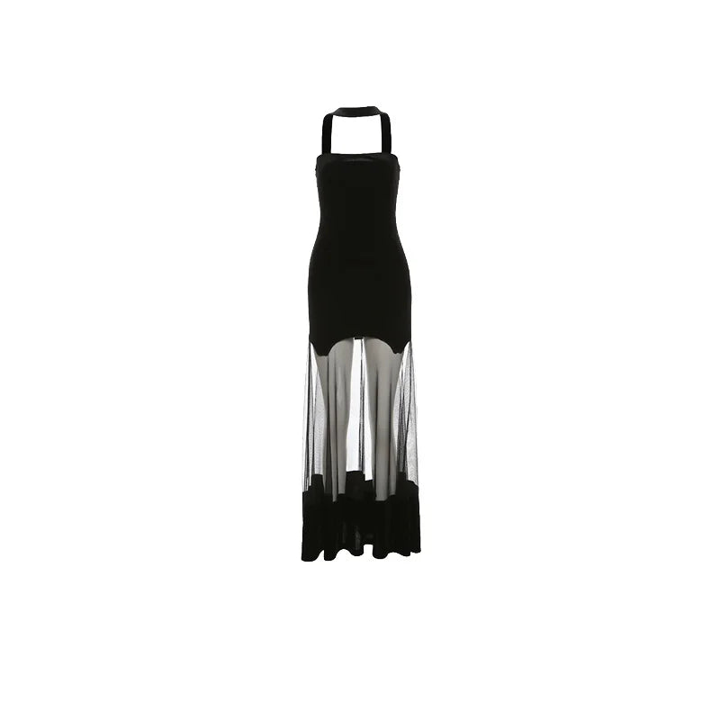This sleek black halter dress features a patchwork design and a slim, ankle-length fit that hugs your curves with slight stretch. Its A-line silhouette and sleeveless cut create a bold, stylish look perfect for making a statement at any formal event.
