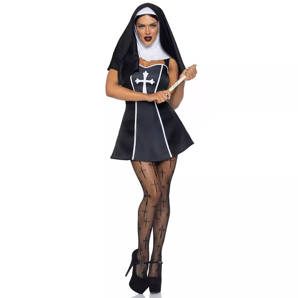 This daring women's nun costume features a knit polyester dress perfect for Halloween or themed events. Designed with bold flair, it captures the classic nun look while adding a playful edge for a standout appearance. Ideal for costume parties and celebrations.