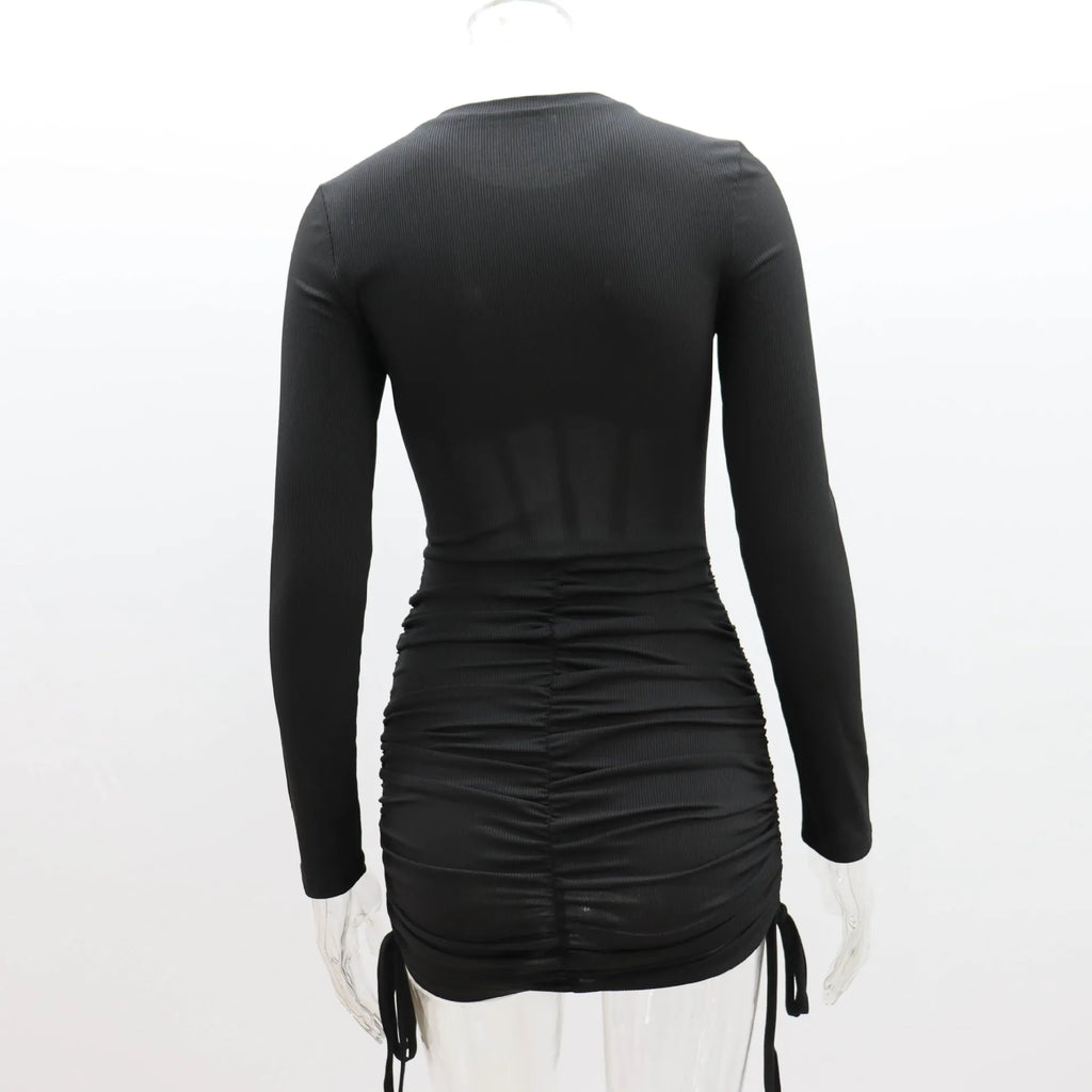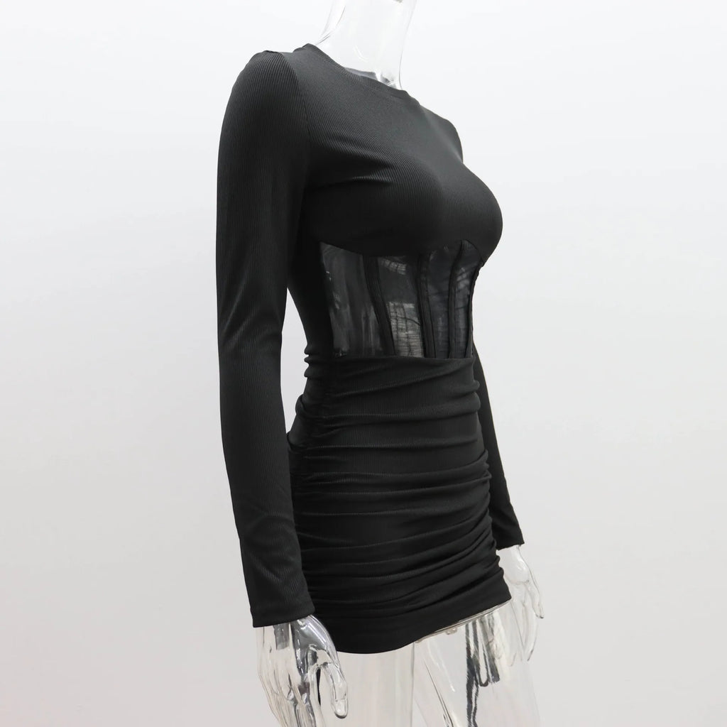 Sleek and bold, this mesh-fringed mini dress commands attention with its sheath silhouette and empire waistline. Crafted from stretchy polyester with subtle shirring details, it hugs your curves in all the right ways. The O-neck and full sleeves offer a sophisticated edge, while the above-knee length keeps things playfully short. Perfect for spring nights when you're ready to turn heads.